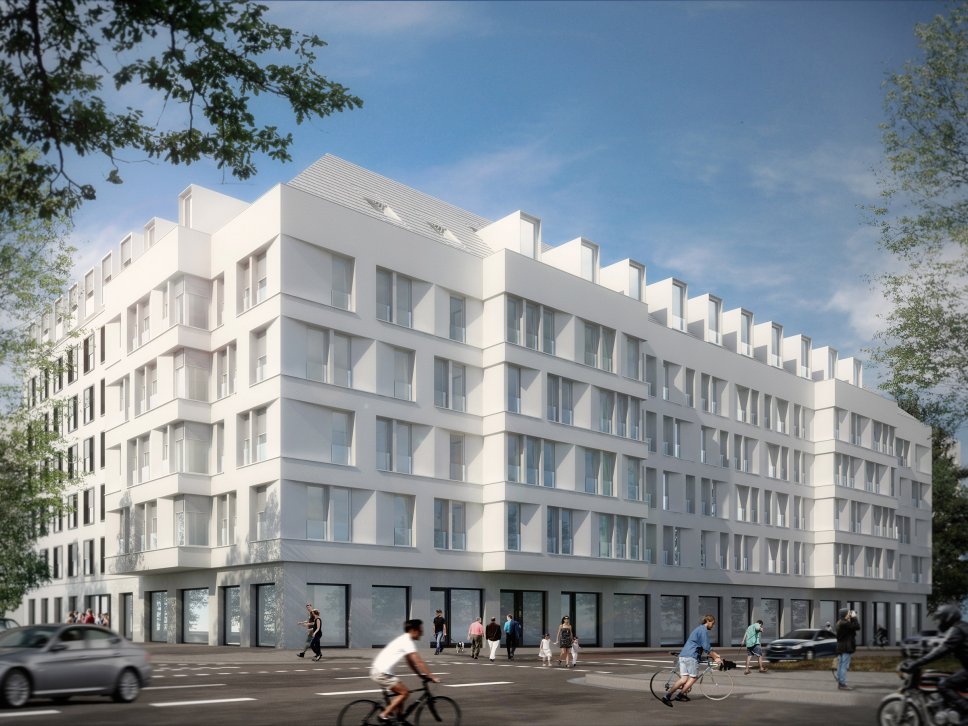 Die Mittelzone der Straßenfassaden nimmt Erker als ortstypische Gliederungselemente auf. Vor- und Rücksprünge entlang der Fenster interpretieren die klassische Lochfassade zeitgemäß. Die zum Innenhof gelegenen Fassaden verfügen ̶ anders als die Straßenfassaden ̶ über großzügige Öffnungen: So sind vor den Wohnungen Balkone und in den Dachgeschossen Terrassen angeordnet.