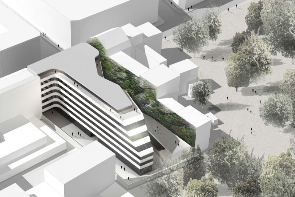 Analog zum nördlichen Nachbargrundstück wird eine Zonierung zur Straße und zum Grünraum des Friedhofes implementiert. Ein Drei-Sterne-Boutique-Hotel soll die Straßenfront mit einer hochwertigen Fassade bebauen; im hinteren Bereich der Gesamtform ist eine Wohnnutzung geplant. Beide Nutzungen erhalten eine Nord-Ost- und Süd-West-Ausrichtung.
