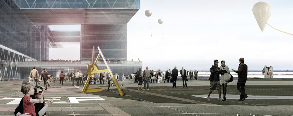 Der Entwurf „Tempelhofer Freiheit“ entwickelt ein neues Konzept für das Tempelhofer Flugfeld und das ehemalige Flughafengebäude von Ernst Sagebiel. Das Gebiet zwischen Flugfeld und Tempelhofer Damm wird mit einem Blockraster belegt, wobei die Bebauung auf einen Streifen zwischen dem Tempelhofer Damm bzw. der S-Bahn-Trasse und dem ehemaligen Taxiway des Flugfeldes begrenzt wird. Die neuen Blöcke halten die für Berlin typische Traufhöhe von 21 Metern ein und besitzen jeweils einen eigenständigen Charakter: So finden sich entlang des Tempelhofer Damms geschlossene Blöcke, während der Taxiway von geöffneten Blöcken gezäumt wird. Eine grüne Achse verbindet die nördliche Landebahn mit dem Gebäude der Zentralbibliothek. Die rigide Blockstruktur wird durch eine lose Konfiguration von Hochpunkten aufgelockert: Ein Punkthochhaus vor der Zentralbibliothek markiert den Zugang zum Quartier. Das Gebäude der Zentralbibliothek besteht aus einem Sockel im Erdgeschoss und zwei darüberliegenden Gebäuderiegeln, die in den obersten beiden Geschossen verbunden werden und den Zwischenraum überdachen. Der Sockel bietet nicht nur einen Blick über das Tempelhofer Feld, sondern erweitert auch die Veranstaltungsfläche. Das Gebäude ist multifunktional: Die Bibliothek ist so nicht nur ein Medienspeicher, sondern entwickelt sich zu einem lebendigen Lernort und einem Treffpunkt für die ganze Stadt. Das Medienangebot wird durch Veranstaltungen und Aktivitäten ergänzt. Dieser Anspruch spiegelt sich im Entwurf des Gebäudes wider: Die Bibliothek ist als Stadt im Kleinen konzipiert. Es entstehen Bereiche mit unterschiedlichem Charakter, von belebten Treffpunkten bis hin zu leisen Lesezonen. Ein fließendes Raumkonzept ermöglicht Flexibilität, die Bibliothek kann zukünftig ohne großen Umbau an die jeweiligen Ansprüche angepasst werden. Lese-, Aufenthalts- und Veranstaltungsbereiche liegen entlang der Fassade, sodass in die Bibliothek gesehen werden kann. Eine Rampe, die innen entlang der Außenfassade verläuft, schafft zweigeschossige Räume, ermöglicht Sichtbeziehungen zwischen verschiedenen Bereichen und wird zu einem Teil der Lesezone.