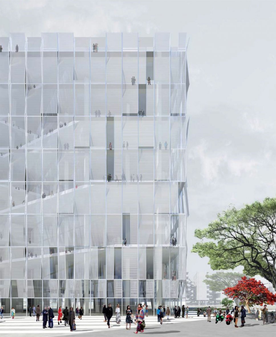 The rectangular shape of the campus is structured by ribbons of buildings that are separated by streets, harmonizing a vivid rhythm of small alleys that are typical of Vietnam’s informal quarters. Juxtaposed against this visage, the diagonal boulevard links the main campus entrance with its various ancillary parts. The green vein, the Broadway, takes centre stage and represents the main artery of the campus’ “soft infrastructure.” It leads directly into the heart of the campus while allowing for pedestrian circulation, water retention facilities and recreational outdoor spaces of the highest quality. The central space at the crossing of the grid and creek system is flanked by two key buildings—the lecture hall in the north, and the library in the south. These iconic buildings identify and amplify the visibility of the campus’ focal point. Adjacently, student accommodations are placed on the edges of the four quadrants, each addressing its own unique contextual condition.