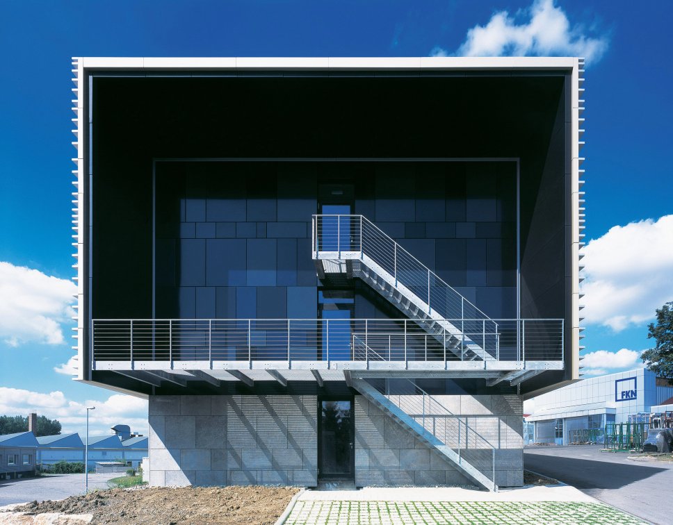 The FKN’s headquarter expansion is located along the main road that leads into the historical town of Neuenstein, in the Baden-Wurttemberg region. A context-specific stone wall delineates the site and leads to the yard, which is elevated in respect to the latter. Since the original building was obsolete in both its form and architectural language, the design team pursued a strategy of creating a new building and tightly grouping it with the surrounding structures. The expansion is linked to the existing administration building by a glassed-in bridge which allows for a functional connection between the two administrative areas.
