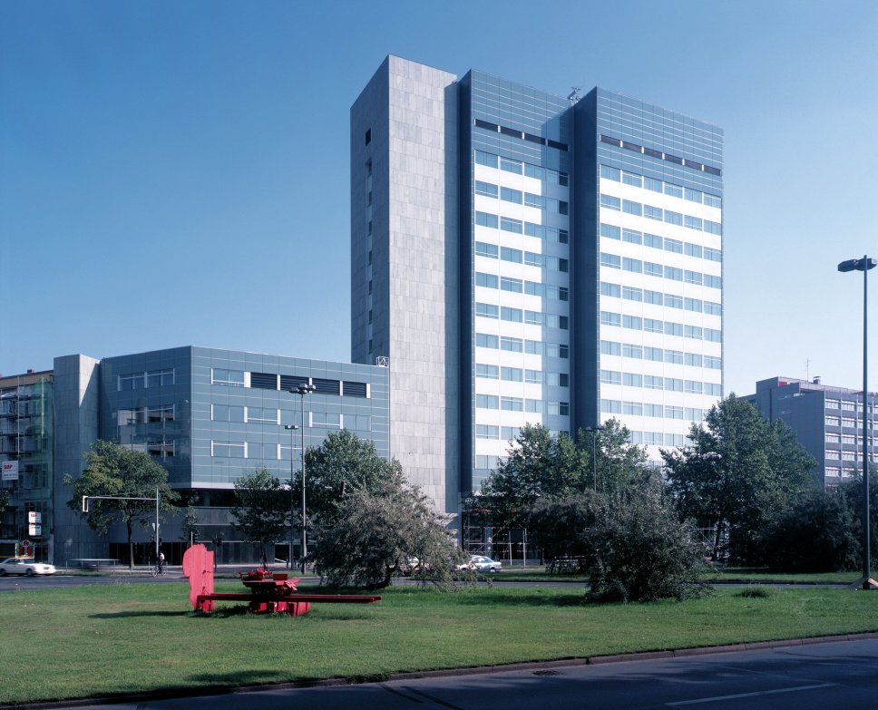 The design team reinterpreted the solitary high-rise slab building into an alignment of three towers, one of which contains the core. This reading is made possible by the new treatment of the elevation. In contrast to the previous wrapping stripes of curtain wall, the façade now expresses its verticality. Reveals between the towers accentuate the additive character of the alignment.